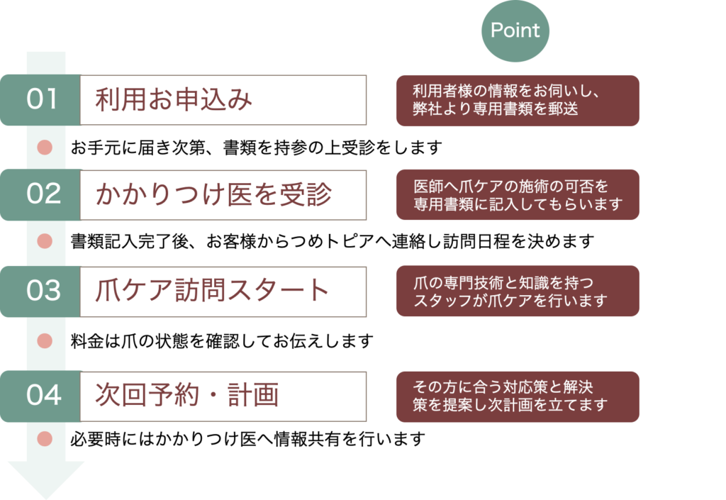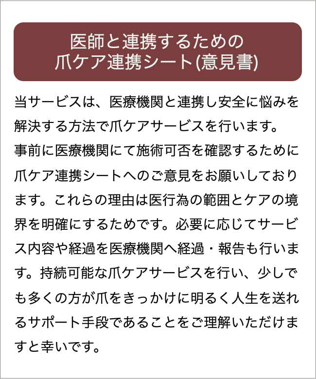 つめトピアのサービスは、事前に当社指定の書面を持参の上、かかりつけ医を受診して医師が爪の施術可否を確認します。