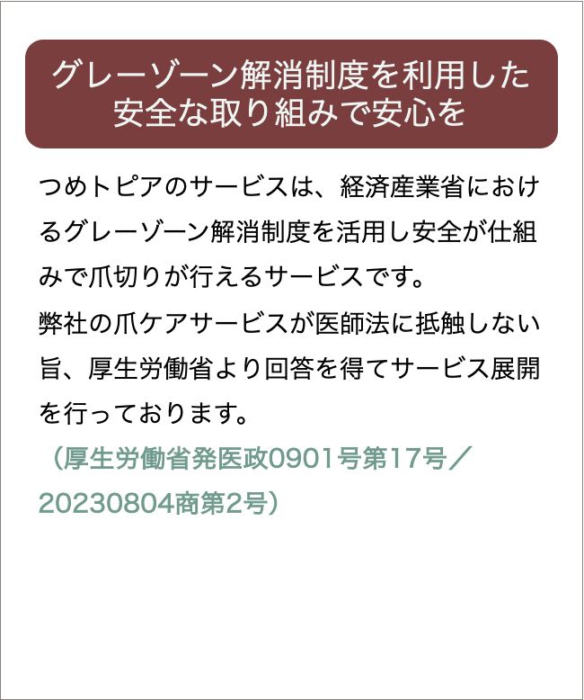 経済産業省のグレーゾーン解消制度を利用し、安心安全な爪切りを行う仕組みで皆様へご案内しております