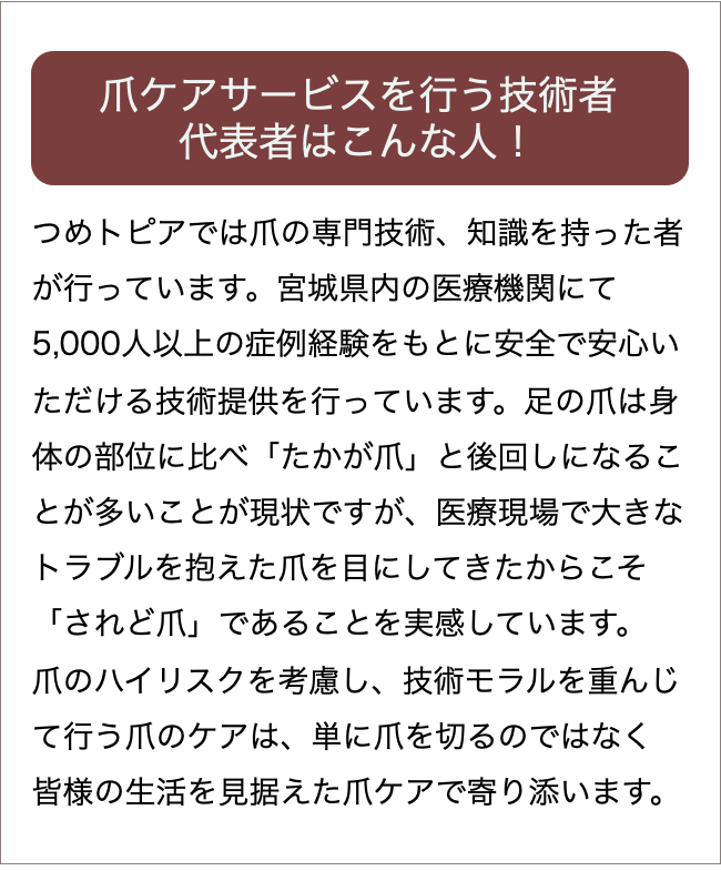 健康な爪を維持するためには定期的な管理が必要です。つめトピアでは、爪切りだけでなく健康な爪の状態を維持するためにお家でできるケアもお伝えしています。