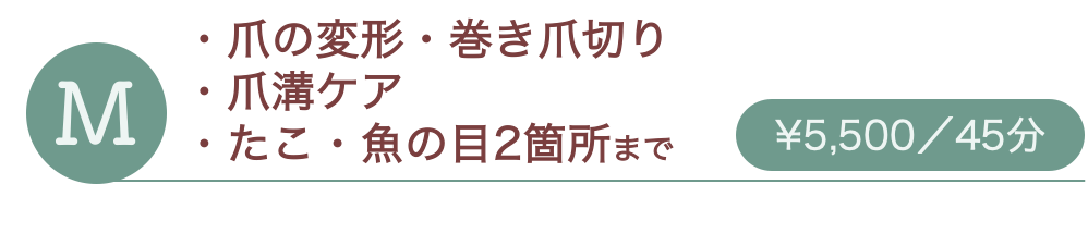 ・巻き爪補正、爪欠損による人工爪形成や補強は別途費用がかかります
